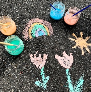 This is a non-toxic and washable, three ingredient art supply for some summer fun. Children can paint on their driveway and once this sidewalk chalk paint dries the colors are vibrant and beautiful. We used this beautiful food coloring. We didn’t use filters for these photos! We experimented with the recipe. The children in my care preferred a watery paint so we brought out a pitcher of water with us to keep adding water to the paint cups. I recommend only painting on a black top since I’m not sure if this will stain light sidewalks or stones.