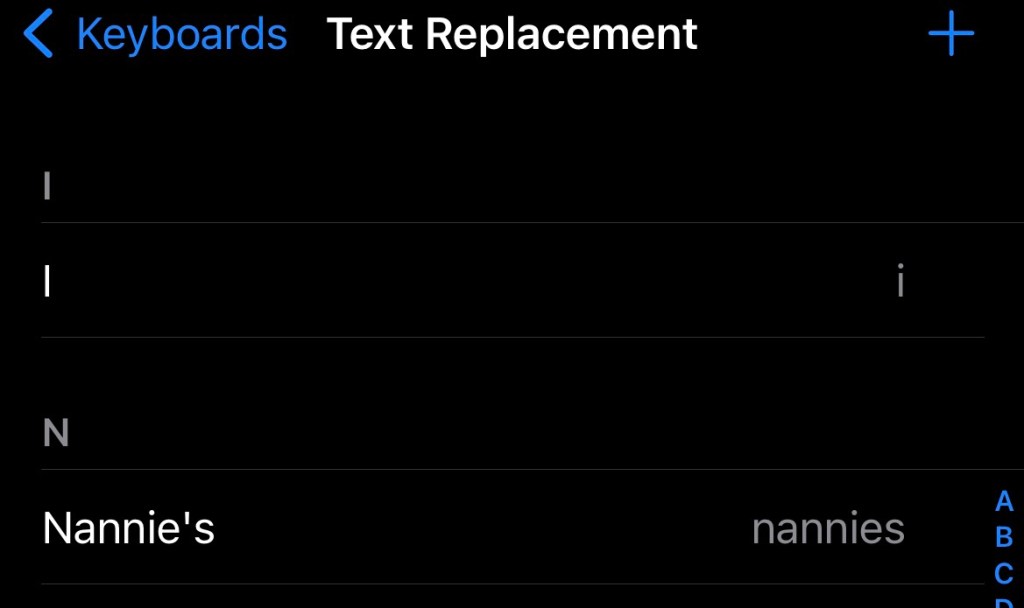 2. Tap the ‘+’ at top of to add a new Text Replacement
