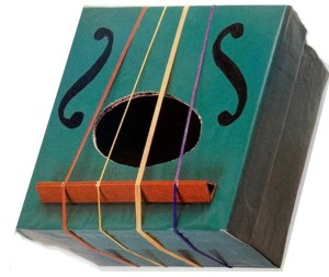 Banjos, guitars, violins, cellos and harps are just a few of the types of Chordophones that all make sound by vibrating strings. Resonators can be made with tin cans, wooden boxes, and cardboard boxes. This is how to make a lap harp out of a cardboard box and rubber bands with children.
