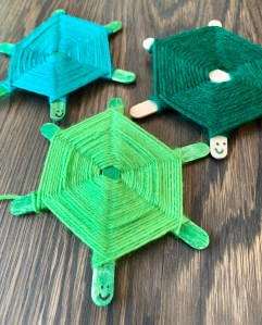 The 8-year-old I care for enjoyed making Ojo de Dios (oh-ho-day-DEE-ohs) yarn crafts this summer. So I glued three crafts sticks together instead of two and the girl figured out how to make turtles all by herself without instructions by me.