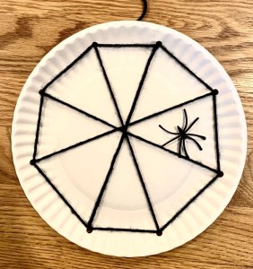 This is a super easy Halloween project that isn’t scary for little kids. Be sure to read children’s books about spiders such as “Anansi the Spider,” “The Very Busy Spider,” “I’m Trying to Love Spiders,” “Mrs. Spider’s Beautiful Web,” and “The Magic School Bus Spins a Web” to correspond with this project. Click here to see how to make spider web pancakes. Tap here to make spider webs from crafts sticks.