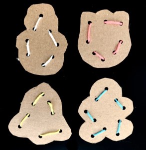 Here is a fun and easy boredom buster to keep the kids busy this holiday season. I used cardboard to make these lacing cards but you can use heavyweight craft paper or foam sheets you can get at the craft store too. Try using all different sized holiday-shaped lacing cards for the little ones to thread as well.