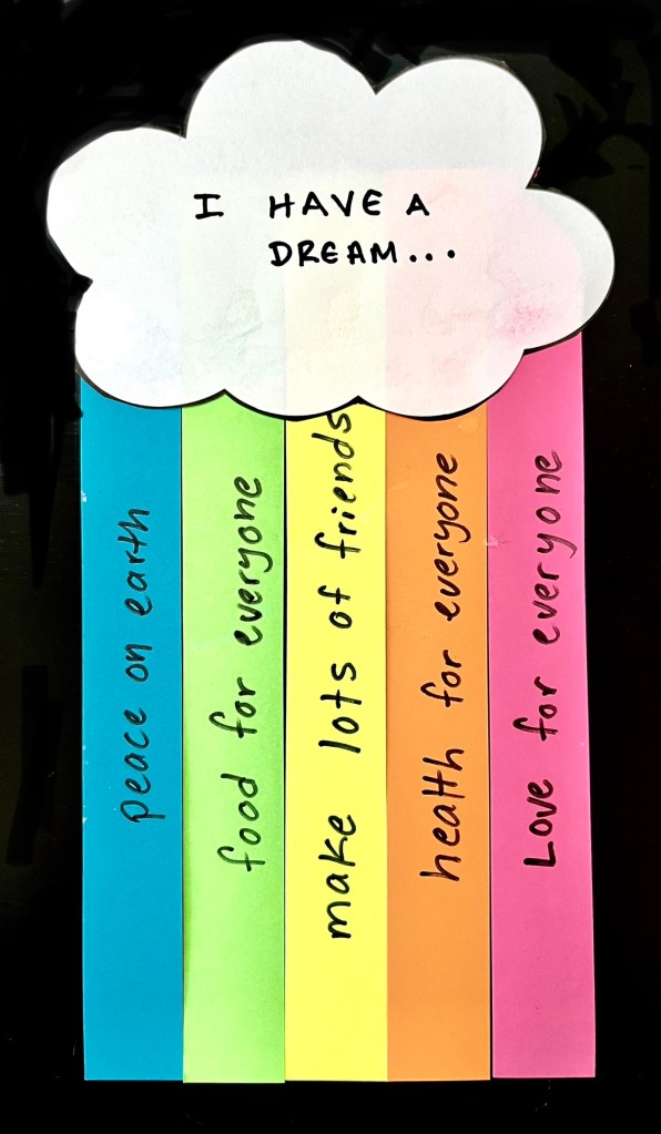Have the children write down what Dr. King’s speech inspire them to dream. Young children may wish for things for themselves such as more toys. But older children should think more about what they dream for their community and world as a whole.