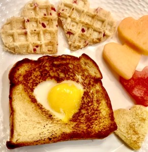 I simply use heart shaped cookie cutters to make the kids a Valentine’s Day breakfast. You can make the most delicious strawberry waffles, pancakes, sliced fruit, and egg in hole all in heart shapes. Here is how to make the egg in a hole: