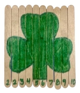 3. Flip the sticks over and place a shamrock template or cookie cutter on the sticks and trace with a red marker. Fill in the heart with a green marker.
