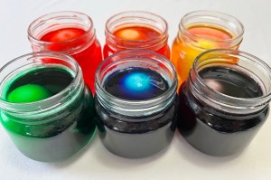 The egg membrane is semi-permeable, which simply means that the liquid vinegar will pass through the membrane into the egg. When the vinegar is dyed, the dye and the vinegar seep into the egg white, creating fun rainbow colors! The brighter the dye that you use, the brighter your egg will be.