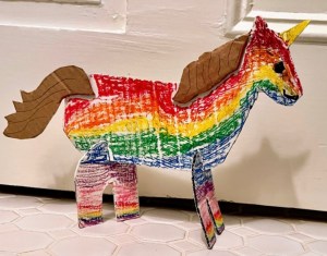 The Mini Mad Things Instagram page sells inexpensive templates to trace onto cardboard to make crafts. I recommend using pastels and paint sticks for these cardboard projects.