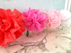 2. Tightly twist a chenille stem around the center of the folded tissue paper. (We twisted some of the stems with both pink and green chenille stems).