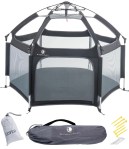 The Pop N’ Go Playpen is great for babies, children, and pets to stay safe on the beach. It has a UV canopy to protects little ones from harmful sun rays (50 SPF), wind, and bugs. It is compact, and simple to build. Assemble the play pen for babies and toddlers in seconds with the easy-to-follow instructions. When you’re done, it fits right into the included travel bag.