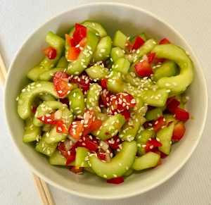 I love trying new ways to serve veggies. The children and their parents love this Asian flavored cucumber salad. It is a light and refreshing salad to serve for yourself and others with Asian meals or as a side dish this summer. Adjust the spices to your liking. Be sure to let the kids help. The 7-year-old I care for enjoyed helping me by scooping out the seeds of the cucumbers with a spoon.