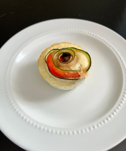 9. Roll 1 piece of zucchini with pieces of roasted pepper. Then roll two more slices of zucchini with red peppers around the other zucchini’s.