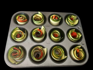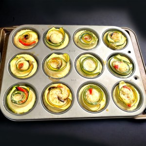 11. Pour egg mixture into the center and around each zucchini roll in the muffin tin.