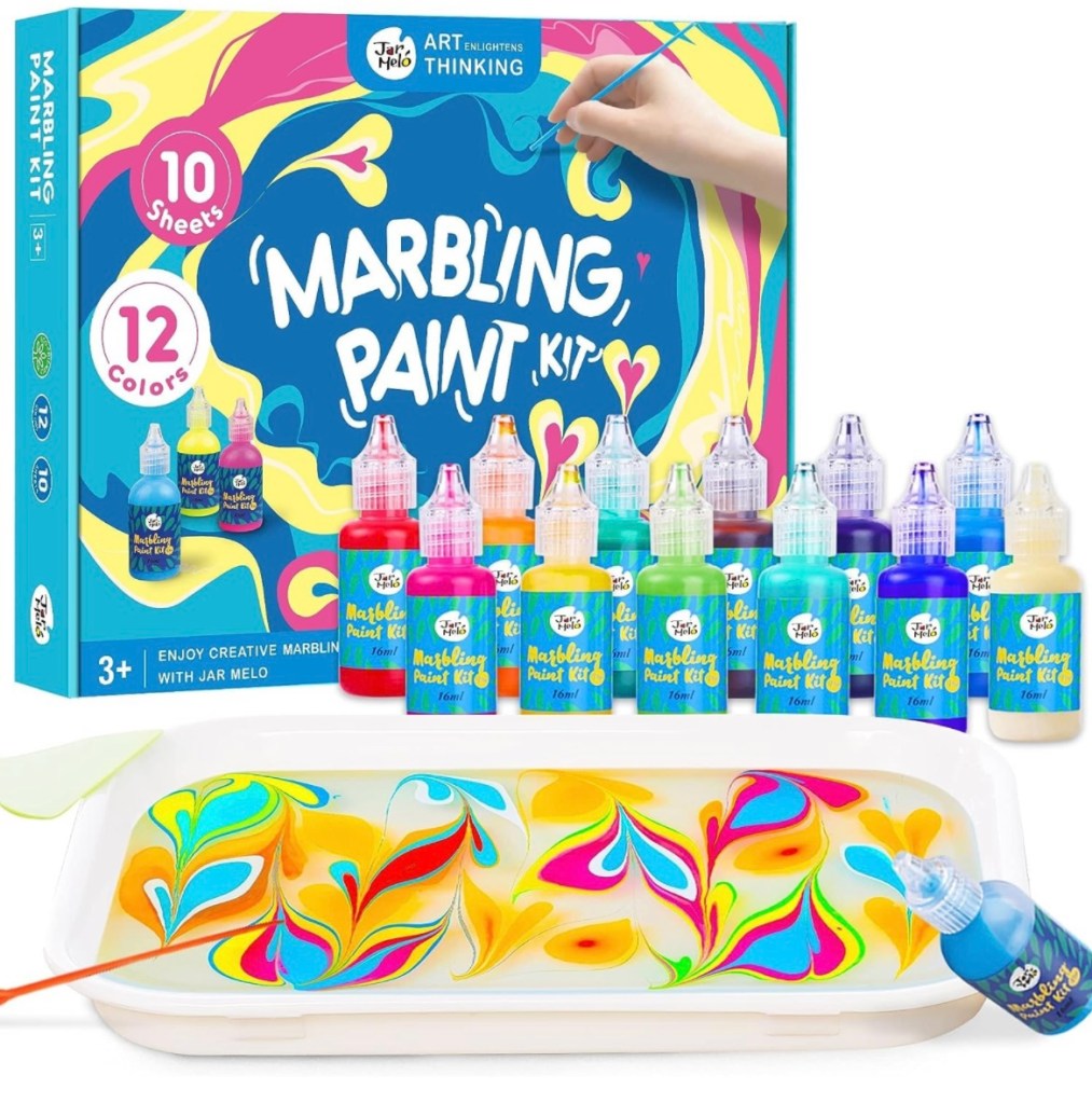 This Marbling Painting Kit for kids comes in a beautiful gift box and makes a great gift for anyone who loves art or wants to explore their creativity. It makes a great present for artists of all ages for a birthday or any holiday.