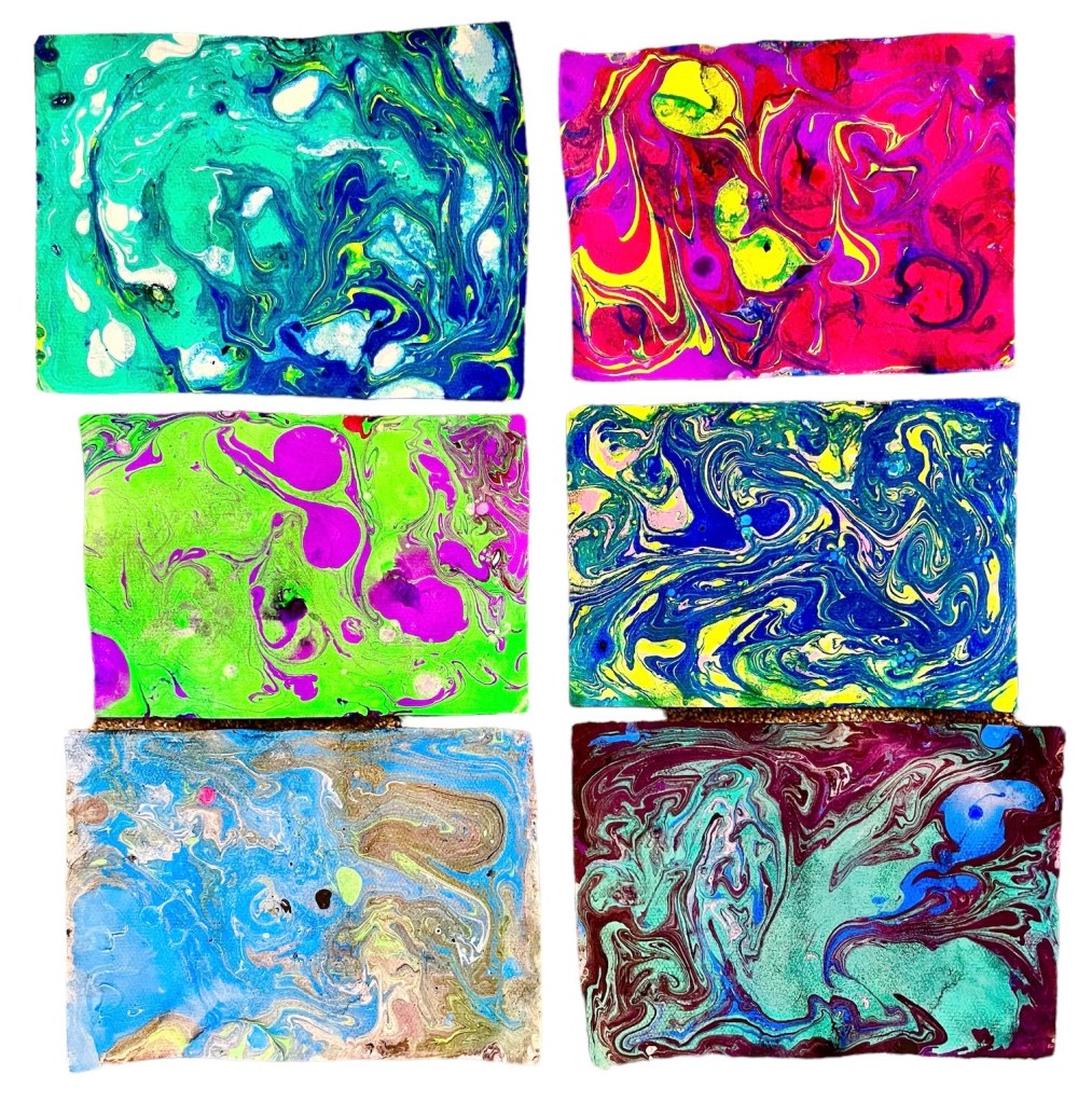 One of my Nanny Kids absolutely adores using this Marbling Paint Kit by the Jar Melo Store. She got this crafts kit for her birthday. She made these six marbled papers this week and cannot wait to do more next week.