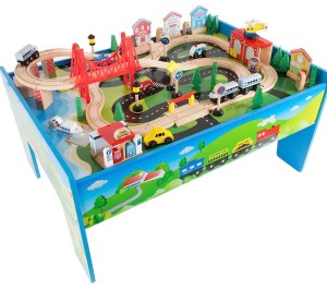This table comes with 75 different train set pieces made of 100% real wood. The hand painted table has a removable 2-piece wooden playing surface, complete with wooden train tracks, wooden trains, helicopter, boats, vehicles, bridge, train and fueling stations, buildings, trees, street signs, and more that will surely thrill any young train enthusiasts or little engineers.