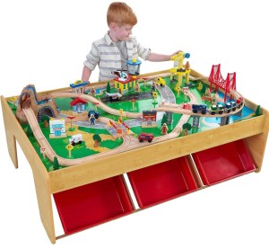 When choosing a train set and train table first consider the manufacturer’s age recommendation. Next, consider the size of the train table for the space the children will be using it in. Finally, determine what kind of storage you want with the the train table.