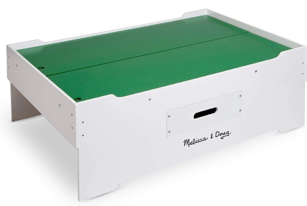 When it comes to wooden toys for children I almost always check out Melissa and Doug products first. I love this train table because it is big enough for multiple kids to play at once and low enough for easy access for toddlers. It stores train tracks, games, puzzle pieces, art supplies, and more in the convenient drawer. The tabletop features two removable panels that are easy to lift out to clean or to vacuum below.