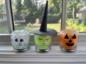 - Allow children to draw Halloween character faces on mason jars. For example we made a ghost, witch, and Jack-o-lantern. Alternately, they can paste construction paper shapes onto the mason jars to make facial features as well.