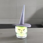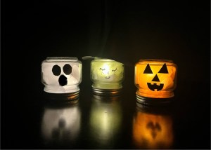 - Turn on a battery operated tea light and place it into some tissue paper the color that corresponds to the Halloween character, and put it in the mason jar. For example, use white tissue paper for a ghost, green for a witch or Frankenstein, and orange for a Jack-o-lantern.