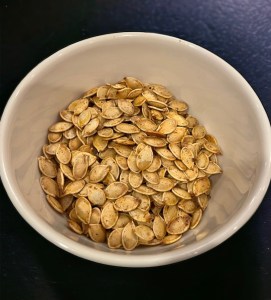 6. Transfer the roasted pumpkin seeds to a bowl to cool down.