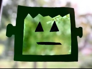 This is an easy Frankenstein Sun Catcher to make with the kids. Click here to see how to make Jack-o-Lanterns and Ghost Sun Catchers as well. I prefer using self-adhesive laminating sheets rather than contact paper, which is more flimsy, to make this adorable Halloween sun catcher.
