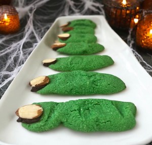 Let the kids make every part of these adorable witch finger cookies. I found the recipe on the detoxinista web site. They are vegan, gluten-free, dairy-free, and naturally colored without using artificial coloring. I am sure the cookies would look more like witch fingers with knuckles and wrinkles if I had made them but I think it’s important to let the kids make the witch fingers cookies themselves. Store in an airtight container in the fridge.