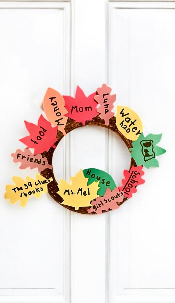 Hang the wreath to proudly display what the child is grateful for to their family and friends for Thanksgiving, or any time of the year.