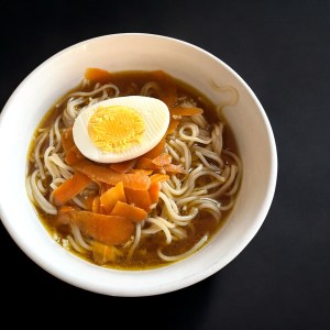 - When the soup is ready, spoon the broth over the noodles. Allow to cool. At this point, make your soft-boiled egg if you’re garnishing with one, and add the rest of your toppings to serve.