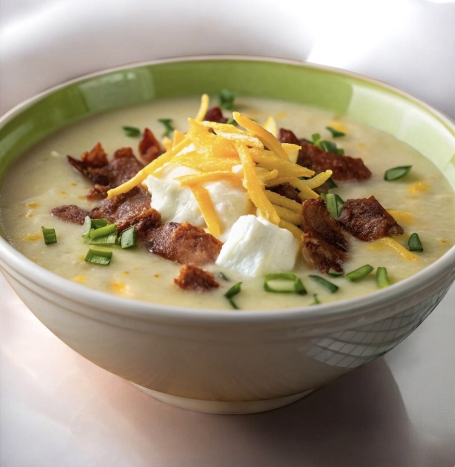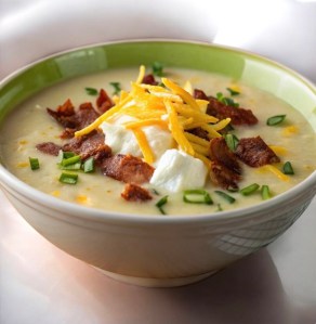 4. Divide soup among bowls. Top with more sour cream, bacon, cheddar, and chives.