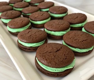 For Saint Patrick’s Day the children I care for and I enjoyed making these chocolate and mint sandwich cookies I found on tasteofhome web site. Be sure to allow the children to help make every part of this recipe from collecting the ingredients, mixing the ingredients, dropping the dough on the baking sheets, and spreading the filling on the cookies.