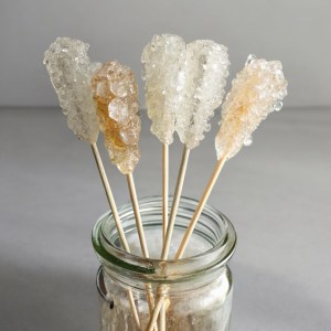 1. Dip one end of the skewer or cake pop stick into water and roll in white sugar. Make the sugar layer 2 to 4 inches thick. Submerge skewers in water, coat them in sugar, and then set out to dry for 1 to 24 hours. This is your crystal seed.