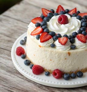 This is a super simple dessert to make for Memorial Day or any patriotic holiday. I simply buy a premade angel food cake from the bakery or grocery store then decorate it with red and blue berries and whipped cream to symbolize the colors of the American flag. Of course you can make your own homemade angel food cake and whipped cream if you prefer.