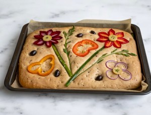The kids will love helping make art on focaccia bread with designs of flowers made of vegetables such as sliced bell peppers, tomato, red onion, olives, and sliced asparagus for flower stems. Don’t limit using just the vegetables we did — use any vegetables you and the children in your care choose to use. I used parchment paper as well as olive oil to help keep the focaccia bread from sticking to the baking sheet.