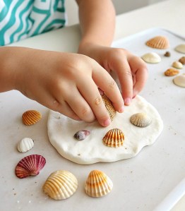 8. Allow the children to press small shells into the clay in any pattern they want. Make sure they press hard enough to create an imprint, but not so hard that they break the clay.