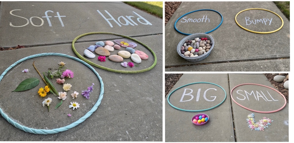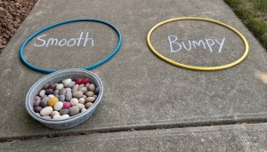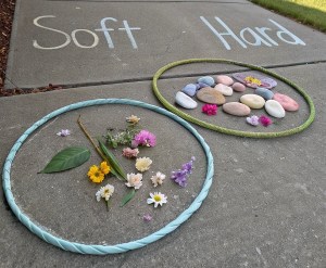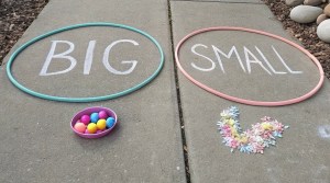 After reading “Hello Hello: Opposites” by Brendan Wenzel put down two hula hoops in the family’s driveway. Use sidewalk chalk to write two opposites above, or inside, the hula hoops for the children to sort objects such as: “Big” and “Small,” “Smooth” and “Bumpy,” or “Soft” and “Hard” with sidewalk chalk.