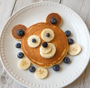 10. Decorate with bananas and berries (we used blueberries) to make the teddy bear face. Serve with maple syrup.