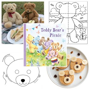 Pull out a blanket or towel and have the kids gather some of their teddy bears and bring them to the picnic blanket. The little ones will love doing all the activities described below while reading, “Teddy Bear Picnic.”