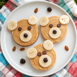 To make the teddy bear sandwiches pictured above use a large circle cookie cutter to make bread into a circle. Spread peanut butter on the bread. Cut out three 3/4-inch to one-inch banana slices horizontally from the banana. Put two banana slices on the bread to look like ears and one on the bottom of the bread to represent the nose. Put two raisins, nuts, berries, or chocolate chips in between the ears to look like eyes and one raisin, nut, berry, or chocolate chip on the bottom banana to look like the bear’s nose.